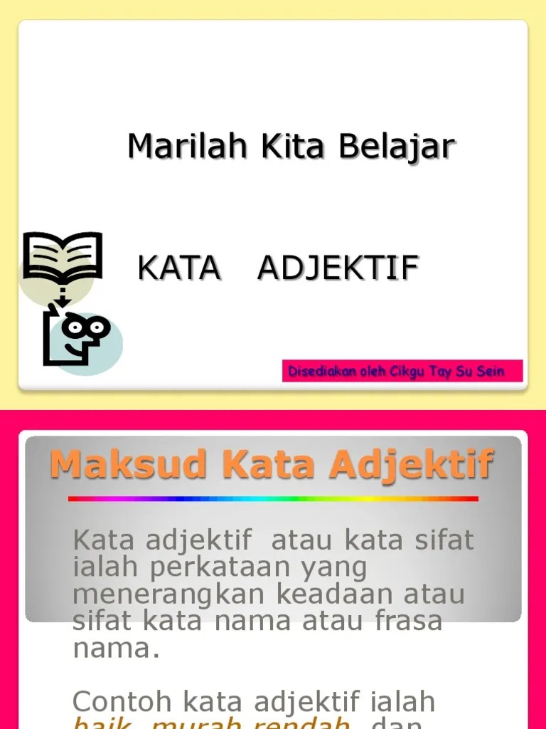Kata adjektif ialah perkataan yang menerangkan sifat atau keadaan sesuatu; contoh kata adjektif tahun 2. Bm kata adjektif (kata sifat) tahap 1 dan 2 :